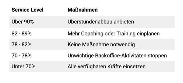 Service Level (in %) = Zahl der Anrufe, die in 20 Sekunden beantwortet wurden/Gesamtzahl der Anrufe