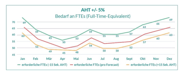 In unserem Beispiel gehen in einem Contact Center durchschnittlich 95.000 Anrufe pro Monat mit einer 5-minütigen Bearbeitungszeit und einem angestrebten Service Level von 80/30 ein. Wenn die AHT im Vergleich zum Forecast um nur 5 % steigt oder sinkt, kann dies eine Schwankung des Bedarfs von 6 FTEs (Full Time Equivalents, zu deutsch: Vollzeitkräfte) zur Folge haben. Im Kontext betrachtet: Rechnest Du noch die Shrinkage hinzu, werden aus den 6 FTEs schnell 10 FTEs. Die finanziellen Auswirkungen sind sogar noch höher, weil neben den zusätzlichen Gehältern noch Lohnnebenkosten anfallen.