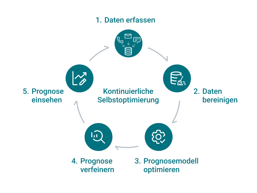 Oft werden wir gefragt, wie die KI-basierte Prognoseerstellung mit Peopleware funktioniert. Lass uns deshalb den Peopleware Forecast Schritt für Schritt durchgehen und mit dem vergleichen, was zuvor vorhanden war. Das Kernelement ist dabei die „kontinuierliche Selbstoptimierung“ des Algorithmus. Das bedeutet, dass kontinuierlich neue Daten und Erkenntnisse in jede Phase des Prognosezyklus einspeist werden.