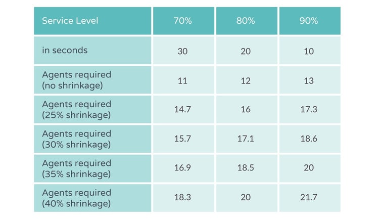 Take a look at the example below with agent requirements for all scenarios, all with 100 calls per hour at a 300 second AHT.